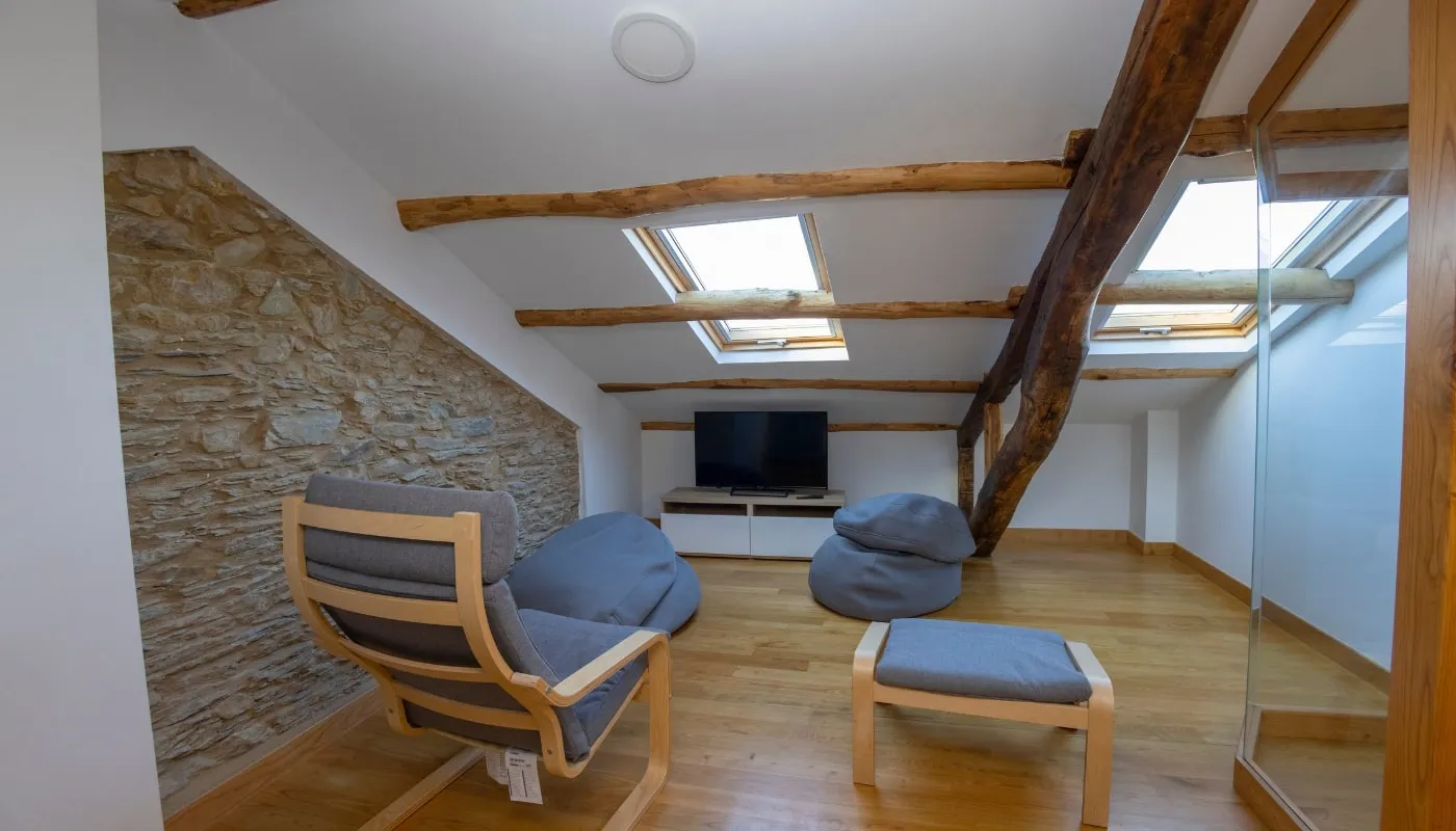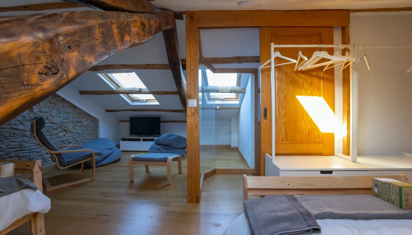 habitación individual con una cama de 90 cm y un desván encantador con 3 camas de