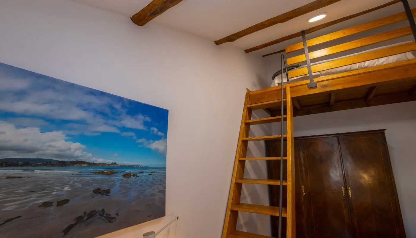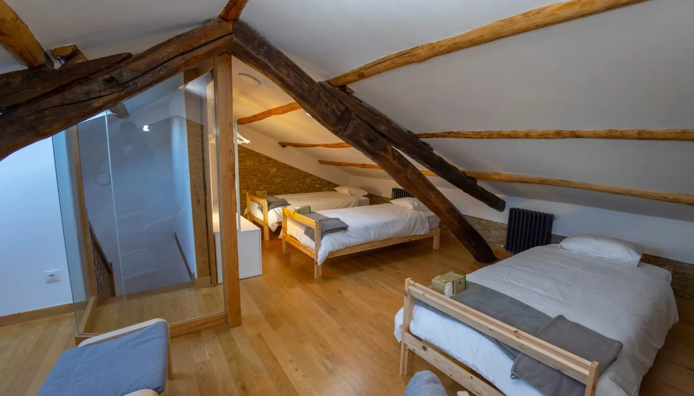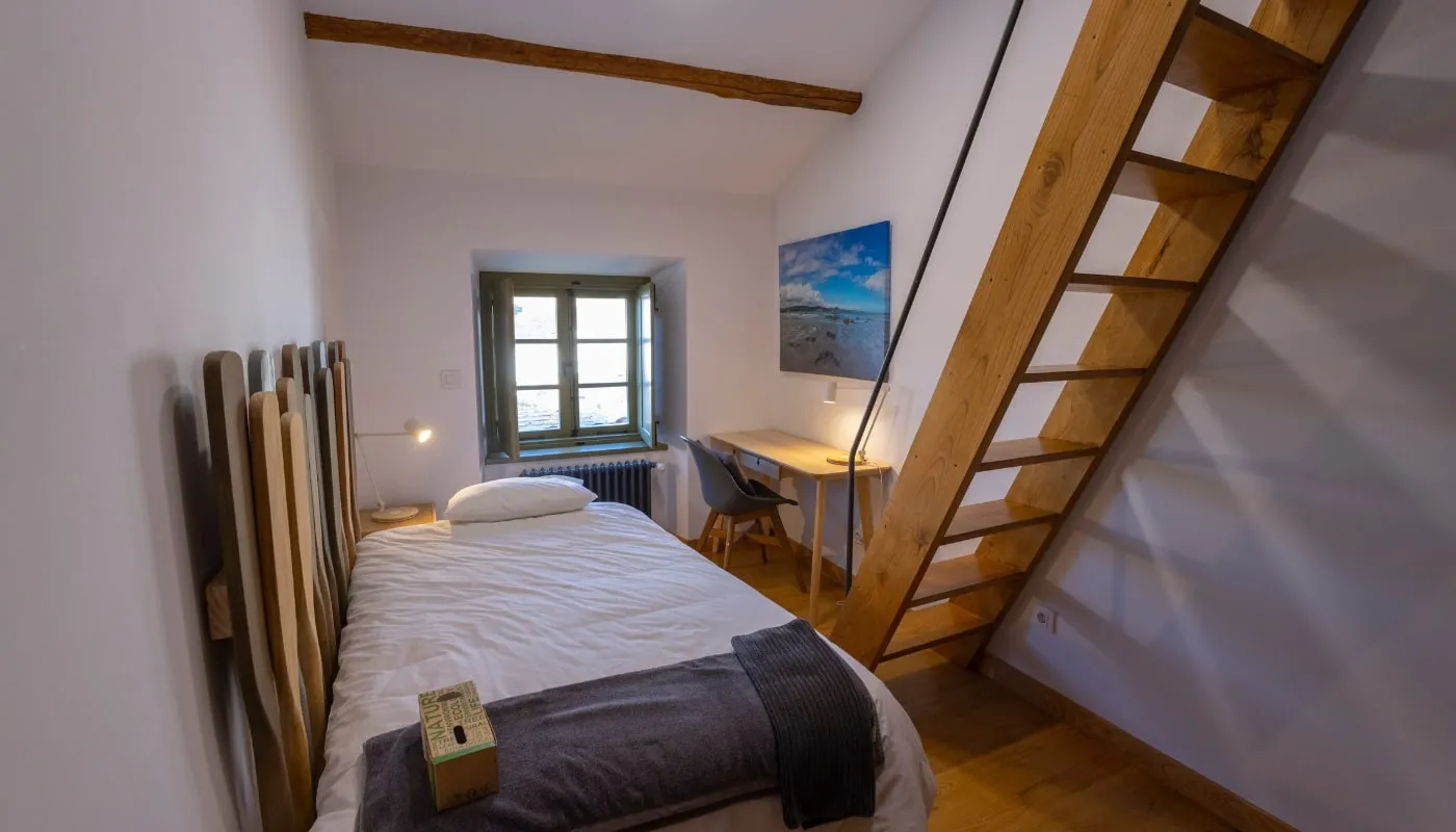 habitación individual con una cama de 90 cm y un desván encantador con 3 camas de